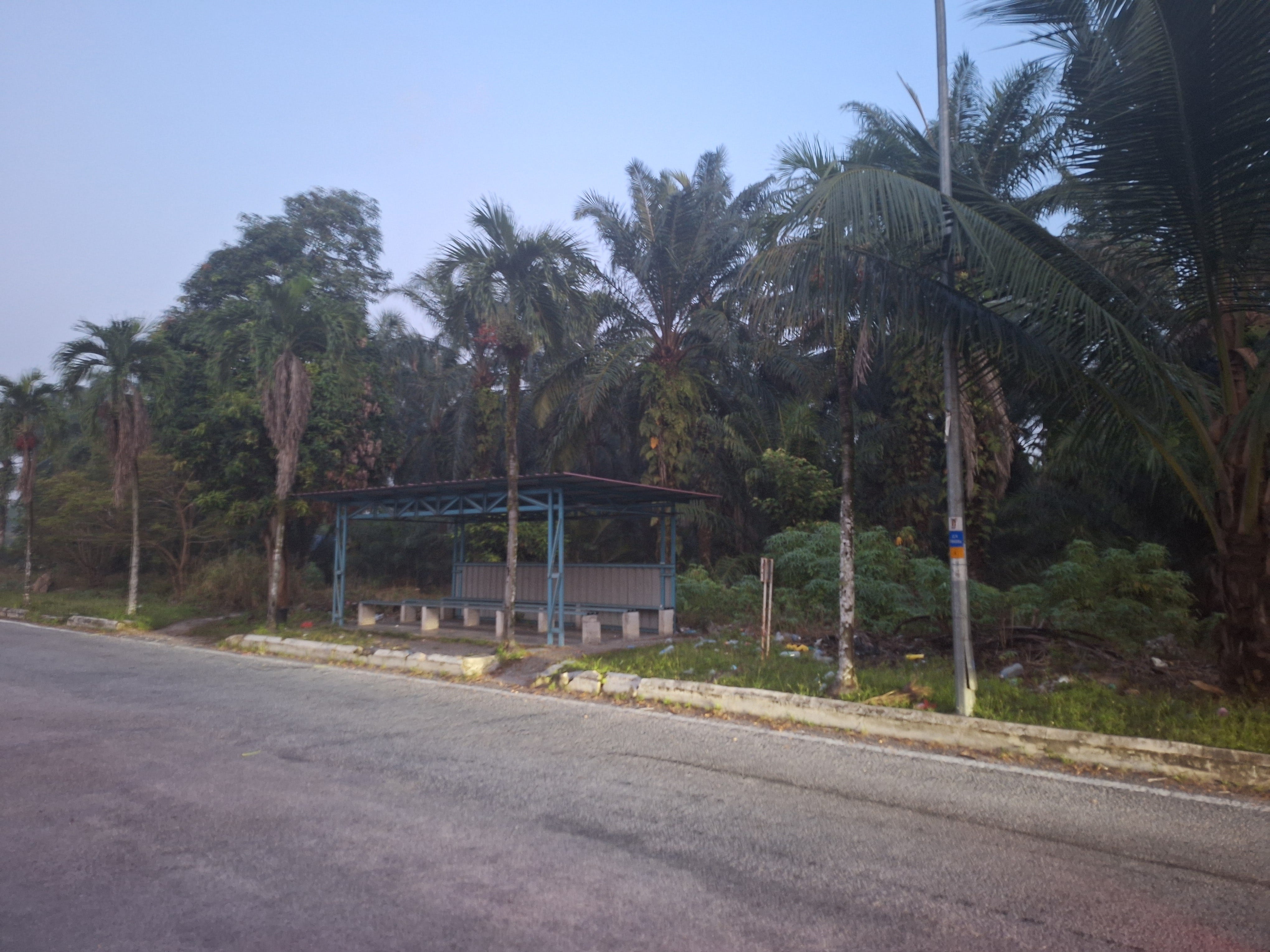 It is early morning, and the sky is rapidly lightening; the banana trees being dwarfed by the coconut palms rising above the dim street lights.